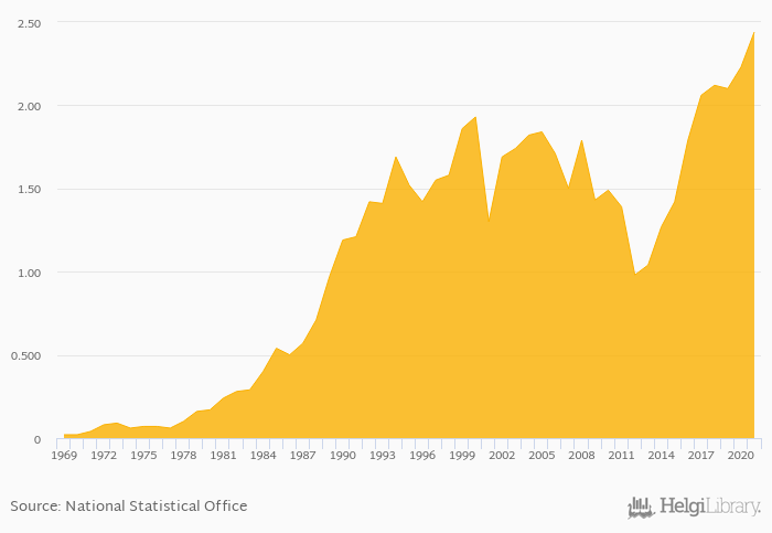 Historically, coffee consumption per capita in South Korea reached an all time high of 2.44 kg in 2021 and an all time low of 0.020 kg in 1969. When compared to South Korea's main peers, coffee consumption per capita in China amounted to 0.190 kg, 0.270 kg in Dem. People's Republic of Korea, 4.10 kg in Japan and 5.77 kg in Vietnam in 2021.