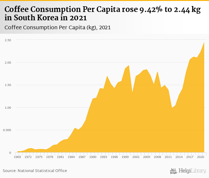 Coffee consumption per capita rose 9.42% to 2.44 kg in South Korea in 2021, according to Faostat.