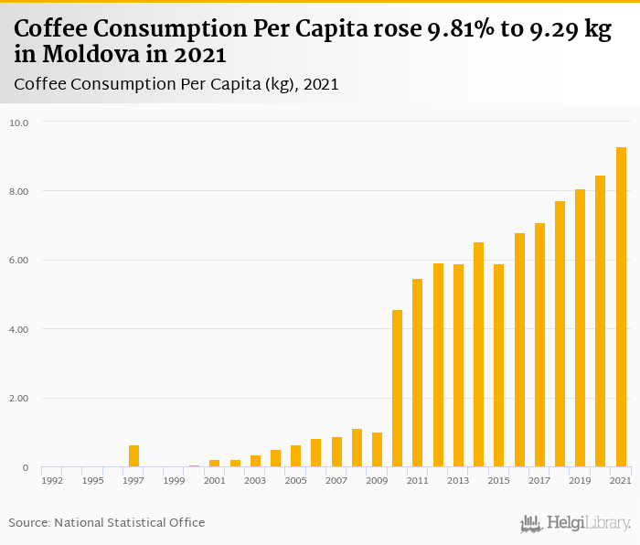 Coffee consumption per capita rose 9.81% to 9.29 kg in Moldova in 2021, according to Faostat.