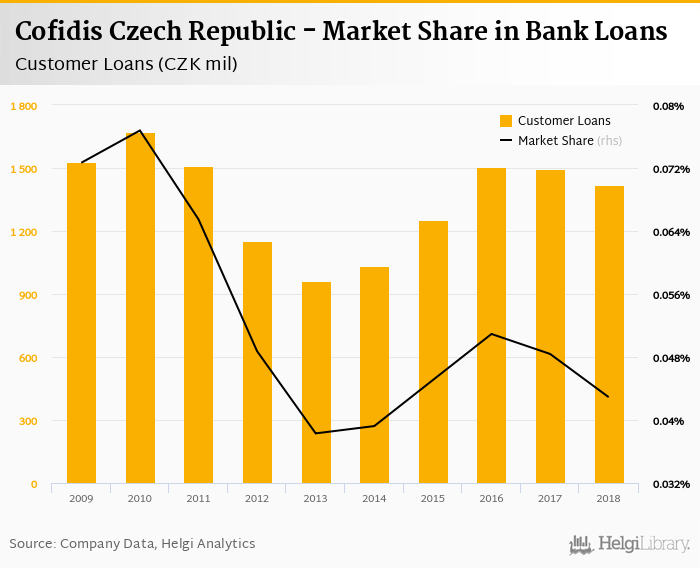 Cofidis Czech Republic accounted for 0.043% of all customer loans issued in Czechia at the end of 2018. Historically, the bank’s market share in customer loans reached an all time high of 0.077% in 2010 and an all time low of 0.038% in 2013.