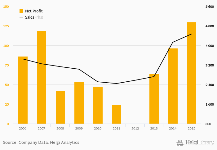 Sales have grown by 0% a year on average since 2005. They reached a high of CZK 4,464 mil in 2015 and a low of CZK 2,439 mil in 2011.