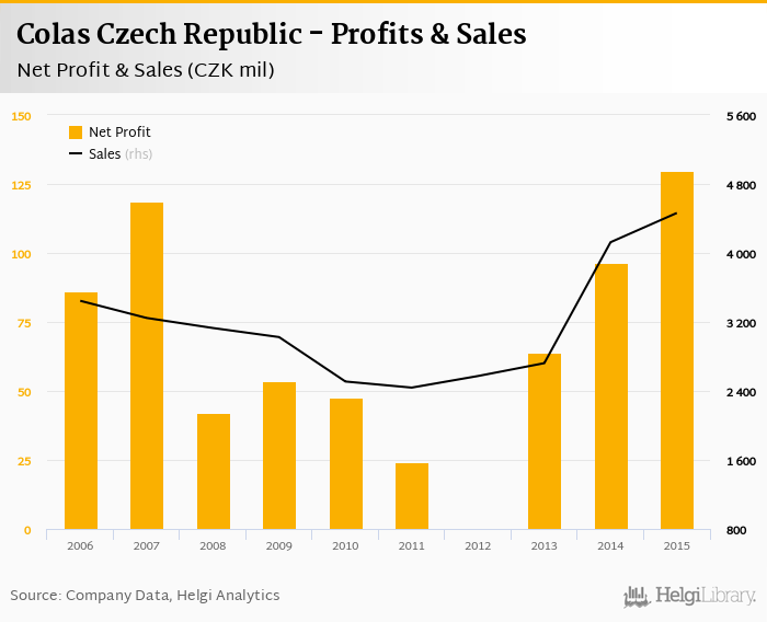 Colas Czech Republic made a net profit of CZK 130 mil in 2015, up 34.3% compared to the previous year. Total sales reached CZK 4,464 mil, which is up 8.22% when compared to the previous year.