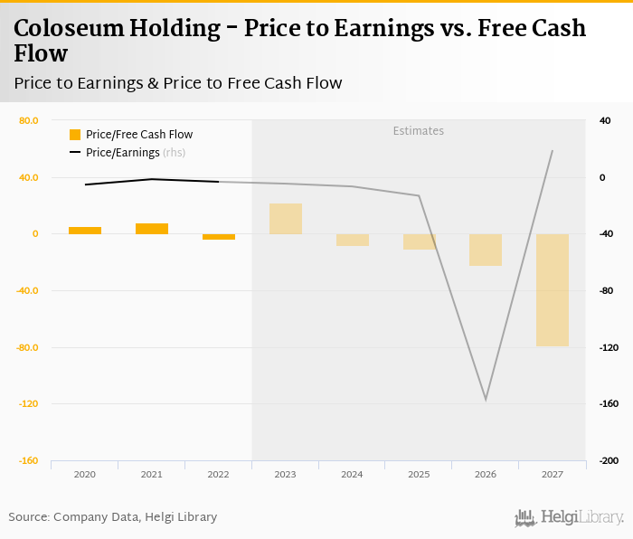 Regarding cash generated defined by the sum of net profit and depreciation, the stock traded at -5.23x at the end of 2022. When investments are excluded to get free cash flow, Coloseum Holding traded at -3.77x.