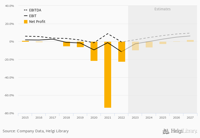 On the operating level, the EBITDA margin reached -0.461% and EBIT amounted to -11.4% of sales in 2022.