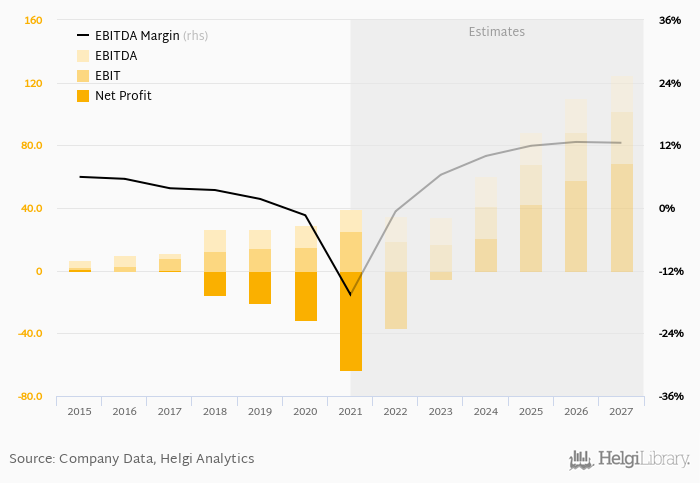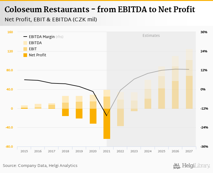 Coloseum Restaurants made a net profit of CZK -63.6 mil with revenues of CZK 145 mil in 2021, down by 103% and down by 1.95%, respectively, compared to the previous year. This translates into a net margin of -43.9%.