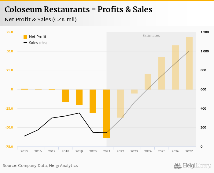 Coloseum Restaurants made a net profit of CZK -63.6 mil in 2021, down 103% compared to the previous year. Total sales reached CZK 145 mil, which is down 1.95% when compared to the previous year.