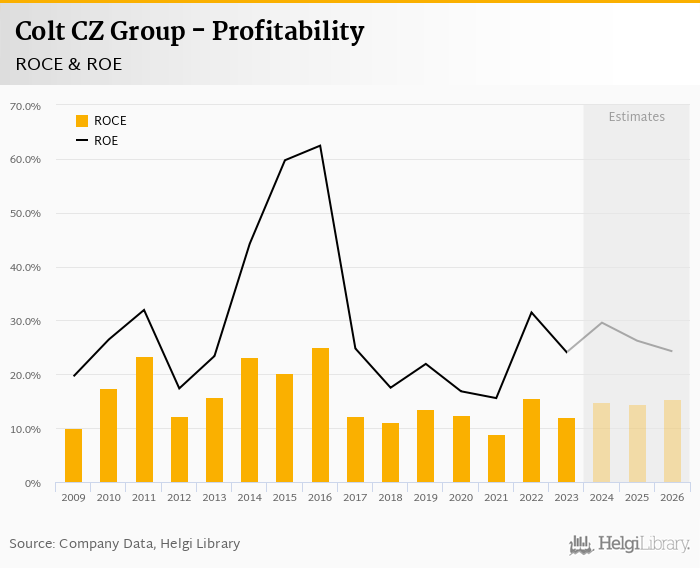 Colt CZ Group made a net profit of CZK 2,043 mil in 2023, up 0.41% compared to the previous year. Historically, between 2009 and 2023, the company's net profit reached a high of CZK 2,043 mil in 2023 and a low of CZK 99.2 mil in 2009.