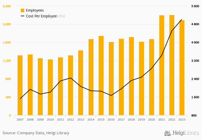 Staff cost represented 19.0% of sales in 2023, 2.3 pp lower than a decade ago.