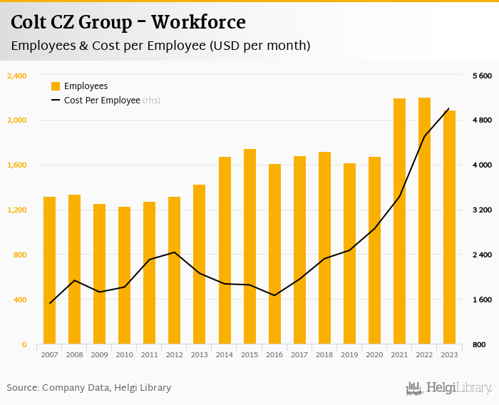 Colt CZ Group employed 2,087 employees in 2023, down 5.35% compared to the previous year. Historically, between 2007 and 2023, the firm's workforce hit a high of 2,205 employees in 2022 and a low of 1,228 employees in 2010.