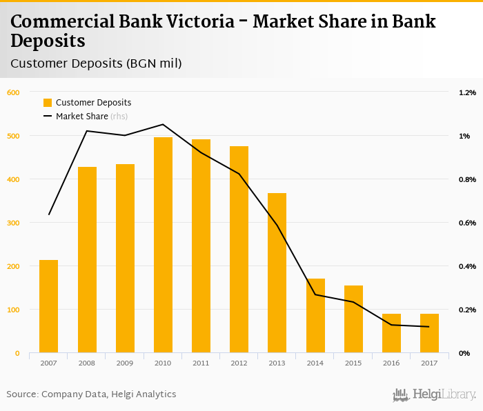 Commercial Bank Victoria accounted for 0.118% of all customer deposits taken by banks in Bulgaria at the end of 2017. Historically, the bank’s market share in customer deposits reached an all time high of 1.05% in 2010 and an all time low of 0.118% in 2017.