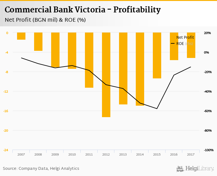 Commercial Bank Victoria made a net profit of BGN -5.15 mil in 2017, up 7.59% compared to the previous year. This implies a return on equity of -15.2%.