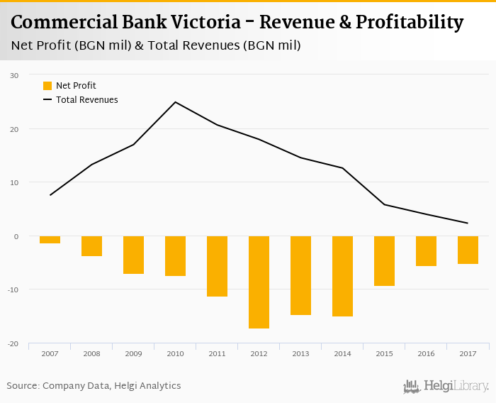 Commercial Bank Victoria made a net profit of BGN -5.15 mil under revenues of BGN 2.27 mil in 2017, up 7.59% and -42.4% respectively compared to the previous year.