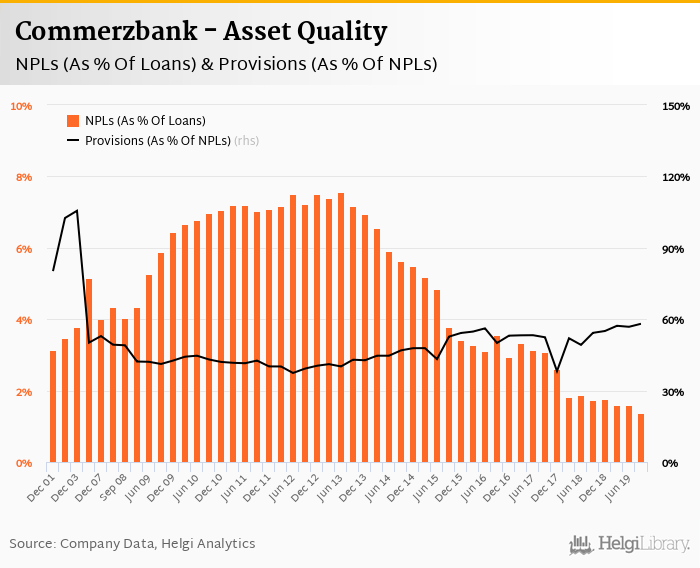 Commerzbank's non-performing loans reached 1.36% of total loans at the end of 2019-09-30, down from 1.75% compared to the previous year. Historically, the NPL ratio hit an all time high of 7.56% in 2013-06-30 and an all time low of 1.36% in 2019-09-30.