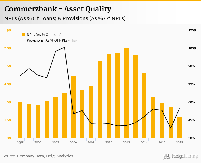 Commerzbank's non-performing loans reached 1.76% of total loans at the end of 2018, down from 2.61% compared to the previous year. Historically, the NPL ratio hit an all time high of 7.50% in 2012 and an all time low of 1.76% in 2018.