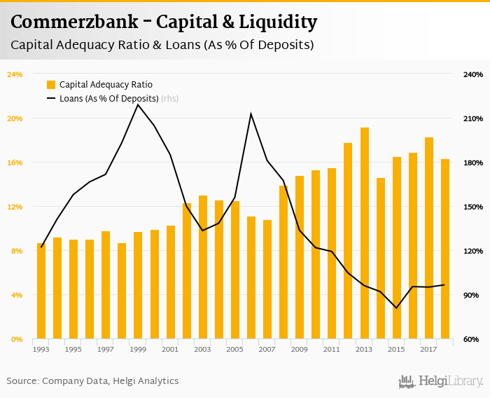 Commerzbank's capital adequacy ratio reached 16.3% at the end of 2018, down from 18.3% compared to the previous year. Historically, the bank’s capital ratio hit an all time high of 19.2% in 2013 and an all time low of 8.70% in 1993.