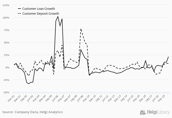 On the other hand, bank's customer deposit growth amounted to 7.82% at the end of 2019-09-30, up from -11.6% when compared to the previous year. Historically, the bank’s deposit growth reached an all time high of 77.5% in 2009-03-31 and an all time low of -17.8% in 2002-12-31. In the last decade, the average annual loan growth amounted to -0.752%.