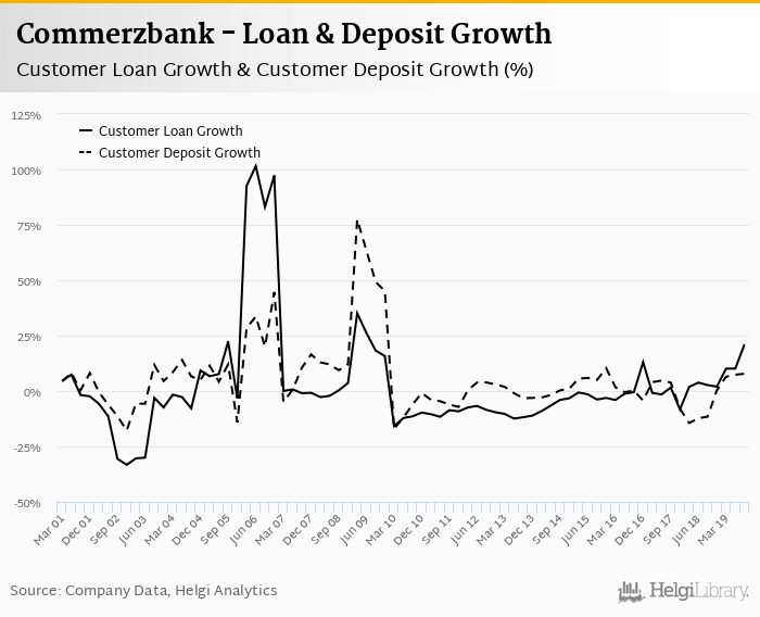 Commerzbank's customer loan growth reached 21.1% in 2019-09-30, up from 2.69% compared to the previous year. Historically, the bank’s loans growth reached an all time high of 102% in 2006-06-30 and an all time low of -33.3% in 2002-12-31. In the last decade, the average annual loan growth amounted to -2.73%.