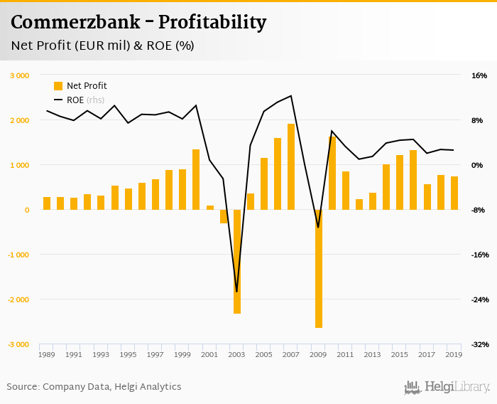 Commerzbank made a net profit of EUR 748 mil in 2019, down 2.91% compared to the previous year. This implies a return on equity of 2.53%.