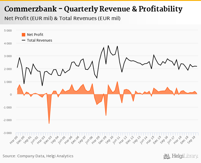 Commerzbank made a net profit of EUR 45.3 mil under revenues of EUR 2,173 mil in the fourth quarter of 2019, down 29.7% and up 16.1% respectively when compared to the same period last year.