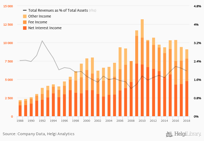 Bank's total revenues accounted for 1.97% total assets in 2018, down from 2.09% a year earlier.