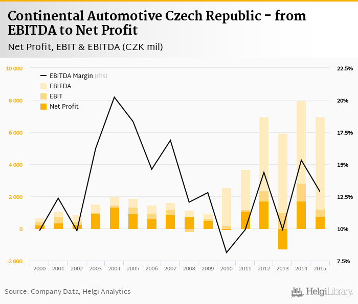 Continental Automotive Czech Republic made a net profit of CZK 772 mil with revenues of CZK 53,927 mil in 2015, down by 54.8% and up by 3.84%, respectively, compared to the previous year. This translates into a net margin of 1.43%.