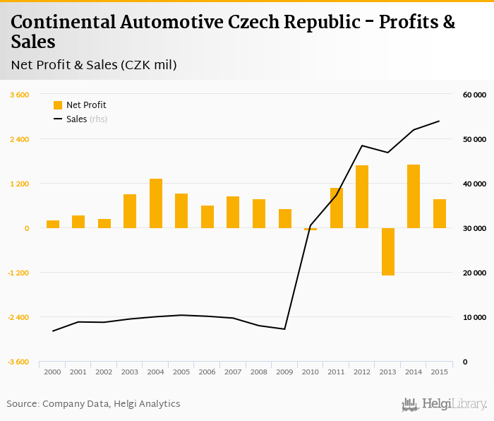 Continental Automotive Czech Republic made a net profit of CZK 772 mil in 2015, down 54.8% compared to the previous year. Total sales reached CZK 53,927 mil, which is up 3.84% when compared to the previous year.