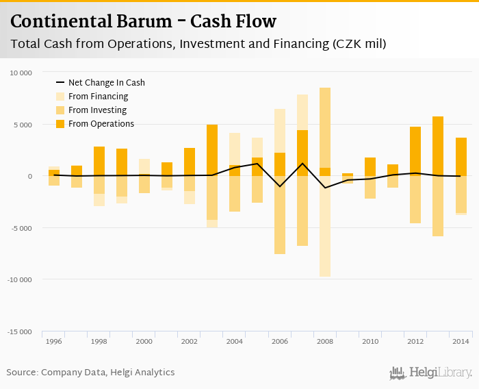 Continental Barum's operating cash flow stood at CZK 3,699 mil in 2014, down 36% when compared to the previous year. Historically, between 1996 - 2014, the firm’s operating cash flow reached a high of CZK 5,784 mil in 2013 and a low of CZK 207 mil in 2000.