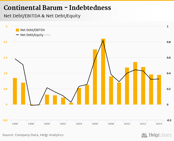 Continental Barum's net debt stood at CZK 8,342 mil and accounted for 0.324 of equity at the end of 2014. The ratio is up 0.006 pp compared to the previous year.