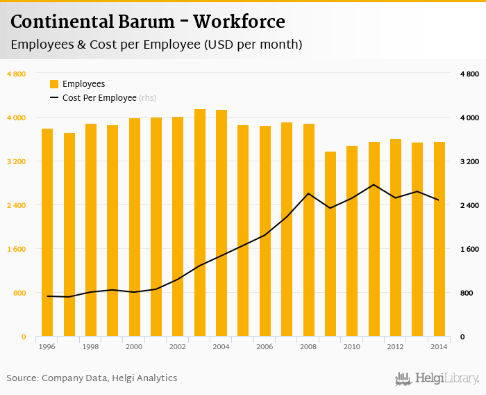 Continental Barum employed 3,559 employees in 2014, up 0.338% compared to the previous year. Historically, between 1994 and 2014, the firm's workforce hit a high of 4,158 employees in 2003 and a low of 3,377 employees in 2009.