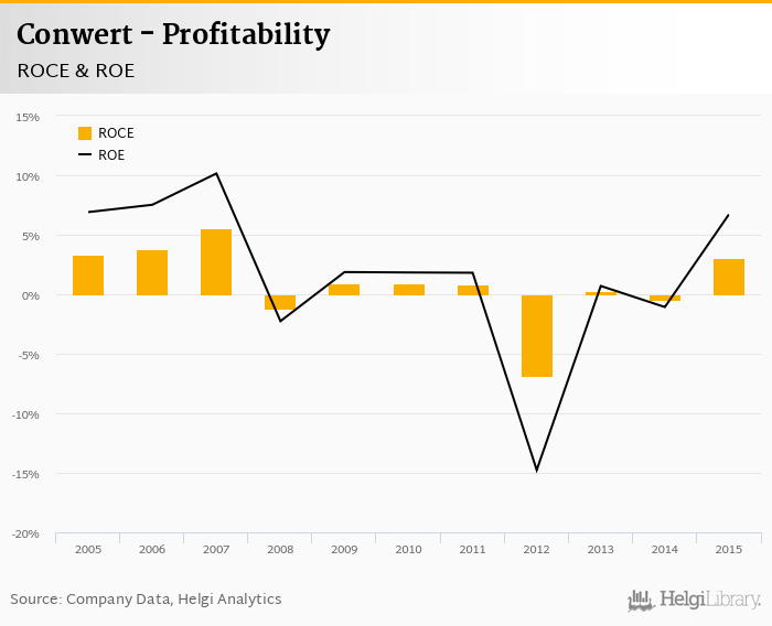 Conwert made a net profit of EUR 79.5 mil in 2015, up 763% compared to the previous year. Historically, between 2004 and 2015, the company's net profit reached a high of EUR 115 mil in 2007 and a low of EUR -168 mil in 2012.