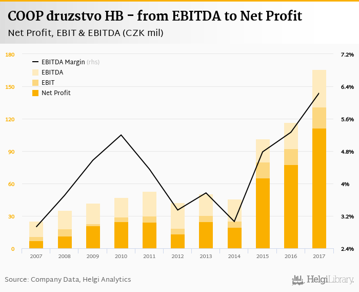 COOP druzstvo HB made a net profit of CZK 111 mil with revenues of CZK 2,660 mil in 2017, up by 43.4% and up by 20.3%, respectively, compared to the previous year. This translates into a net margin of 4.19%.