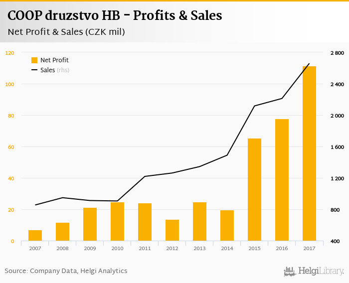 COOP druzstvo HB made a net profit of CZK 111 mil in 2017, up 43.4% compared to the previous year. Total sales reached CZK 2,660 mil, which is up 20.3% when compared to the previous year.