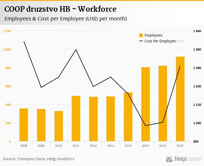 COOP druzstvo HB employed 922 employees in 2017, up 12% compared to the previous year. Historically, between 2008 and 2017, the firm's workforce hit a high of 922 employees in 2017 and a low of 330 employees in 2010.