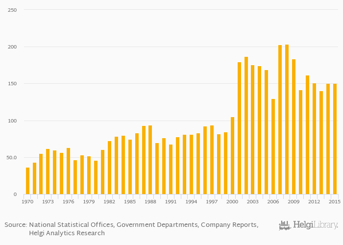Copper (smelter) production rose 0% to 150 kt in Sweden in 2015, according to the National Statistical Office.