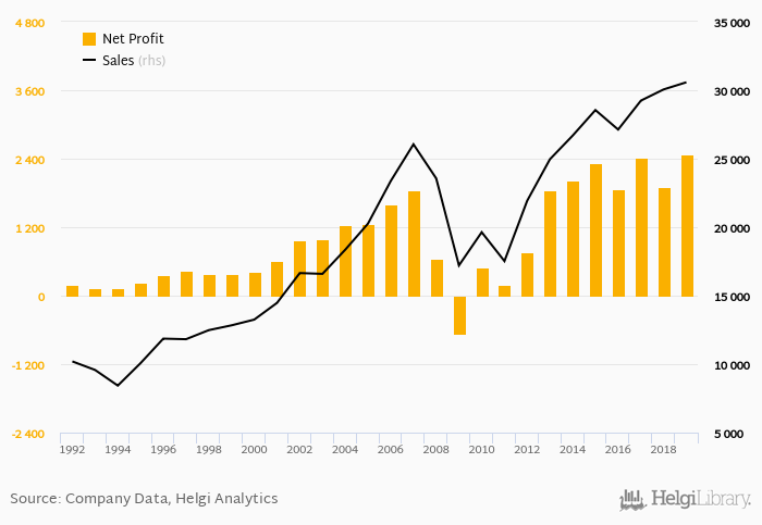 Sales have grown by 5.92% a year on average since 2009. They reached a high of JPY 30,580 bil in 2019 and a low of JPY 8,431 bil in 1994.