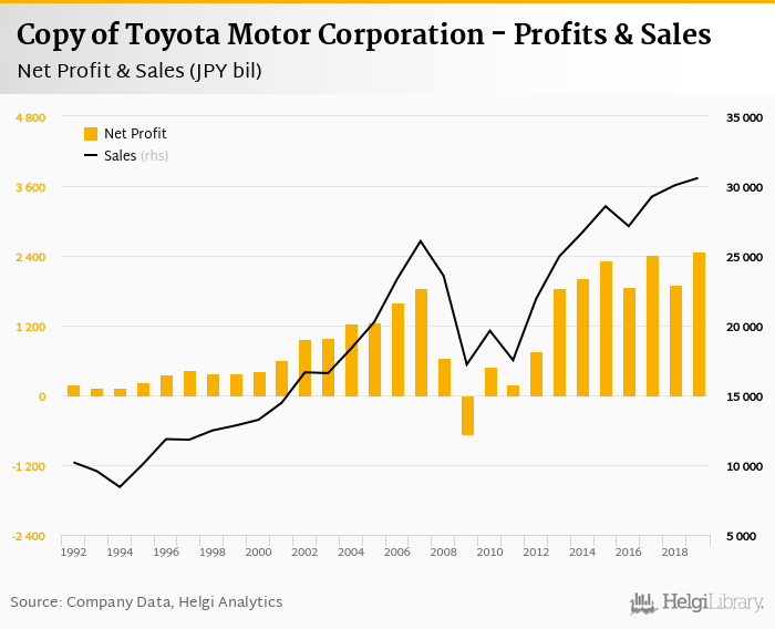 Toyota Motor Corporation made a net profit of JPY 2,473 bil in 2019, up 29.9% compared to the previous year. Total sales reached JPY 30,580 bil, which is up 1.74% when compared to the previous year.
