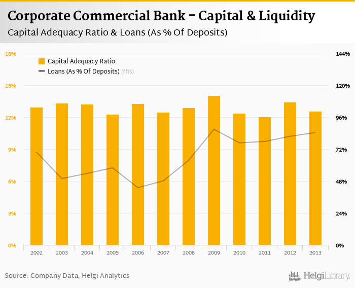 Corporate Commercial Bank's capital adequacy ratio reached 12.6% at the end of 2013, down from 13.4% compared to the previous year. Historically, the bank’s capital ratio hit an all time high of 14.0% in 2009 and an all time low of 12.1% in 2011.