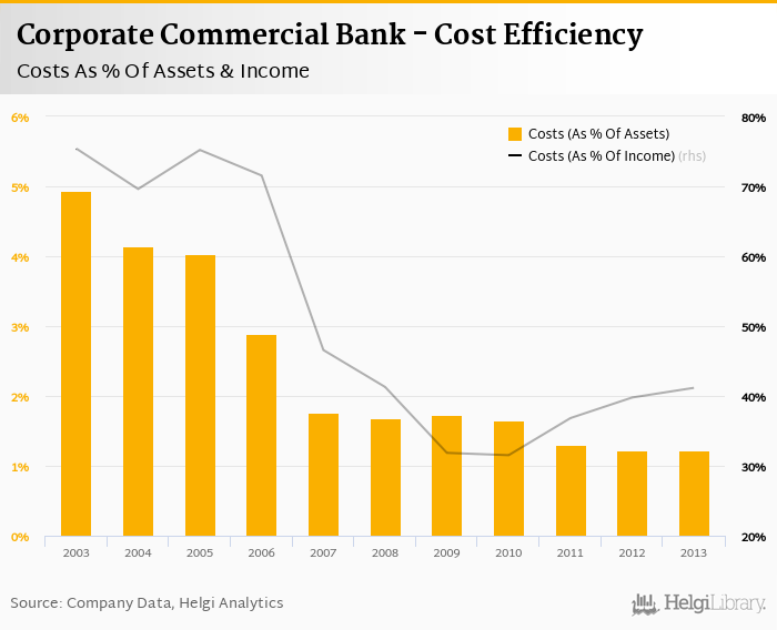 Corporate Commercial Bank's cost to income ratio reached 41.2% in 2013, up from 39.8% compared to the previous year.