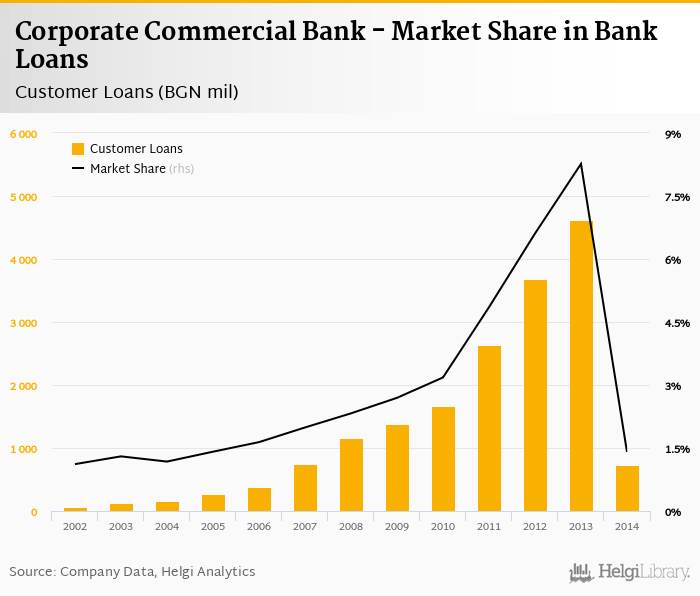 Corporate Commercial Bank accounted for 1.41% of all customer loans issued in Bulgaria at the end of 2014. Historically, the bank’s market share in customer loans reached an all time high of 8.26% in 2013 and an all time low of 1.12% in 2002.