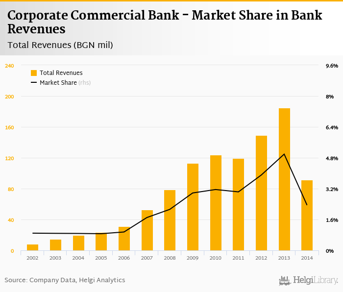 Corporate Commercial Bank generated total banking revenues of BGN 91.4 mil in 2014, down 50.6% compared to the previous year.