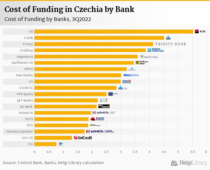 In terms of momentum, Komercni Banka's cost of funds increased the most in the last 12 months, from 1.03% to from 5.53%, followed by CSOB (up by 3.79 bp) and Trinity Bank (up 3.73 bp).