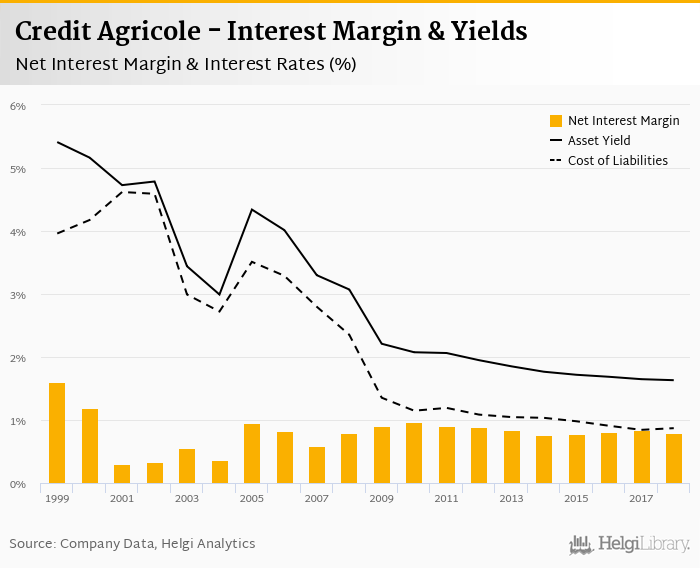Credit Agricole's net interest margin amounted to 0.797% in 2018, down from 0.839% compared to the previous year.