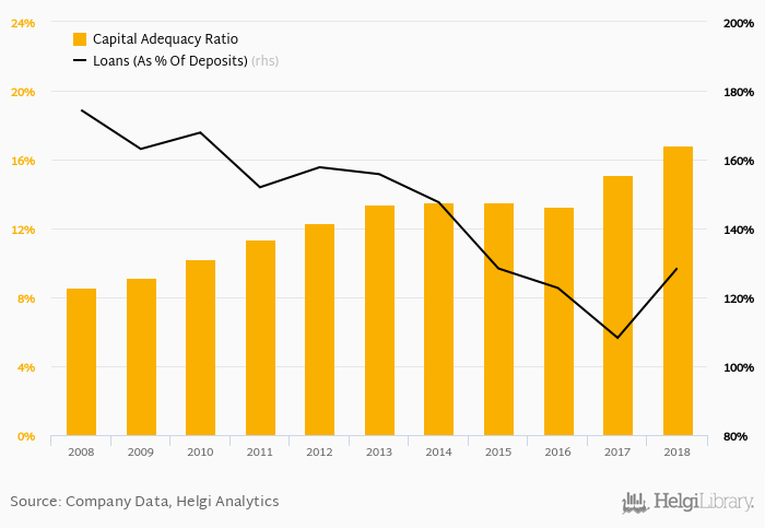Bank's loan to deposit ratio reached 128% at the end of 2018, up from 108% when compared to the previous year. Some 10 years ago, loan to deposit ratio of the bank amounted to 174%.