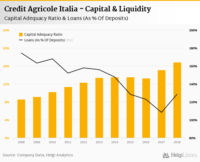 Credit Agricole Italia's capital adequacy ratio reached 16.8% at the end of 2018, up from 15.1% compared to the previous year. Historically, the bank’s capital ratio hit an all time high of 16.8% in 2018 and an all time low of 8.57% in 2008.
