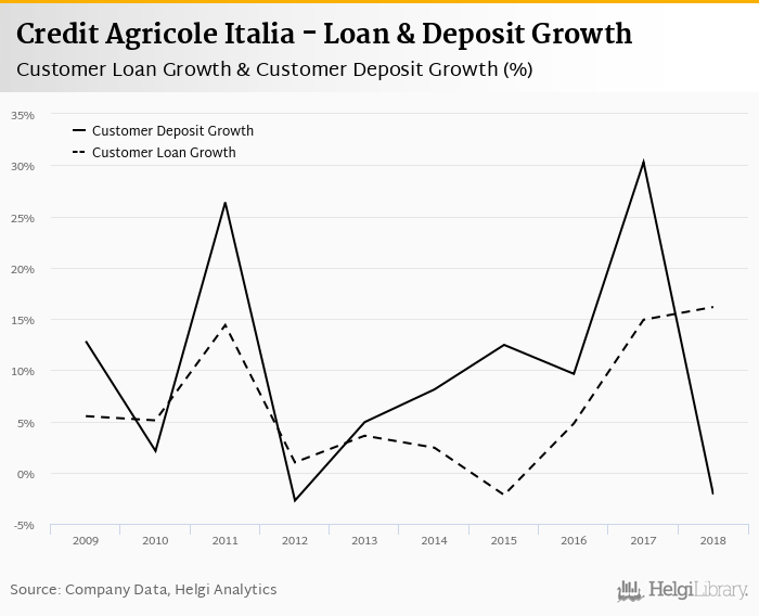 Credit Agricole Italia's customer loan growth reached 16.2% in 2018, up from 14.9% compared to the previous year. Historically, the bank’s loans growth reached an all time high of 16.2% in 2018 and an all time low of -2.18% in 2015. In the last decade, the average annual loan growth amounted to 0%.