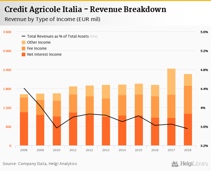 Credit Agricole Italia generated total banking revenues of EUR 2,265 mil in 2018, down 6.97% compared to the previous year.