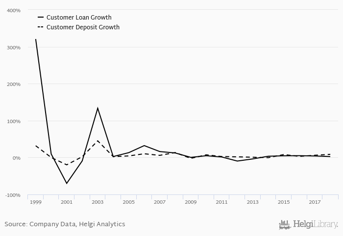 On the other hand, bank's customer deposit growth amounted to 8.61% at the end of 2018, up from 6.16% when compared to the previous year. Historically, the bank’s deposit growth reached an all time high of 45.2% in 2003 and an all time low of -19.8% in 2001. In the last decade, the average annual loan growth amounted to 3.53%.