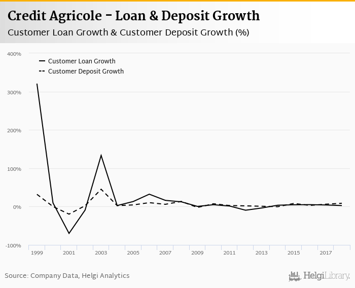 Credit Agricole's customer loan growth reached 2.67% in 2018, down from 4.13% compared to the previous year. Historically, the bank’s loans growth reached an all time high of 321% in 1999 and an all time low of -70.0% in 2001. In the last decade, the average annual loan growth amounted to 1.24%.