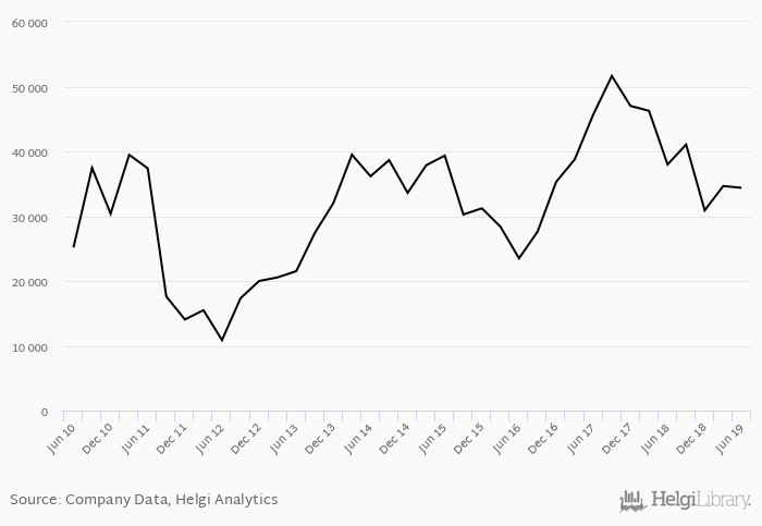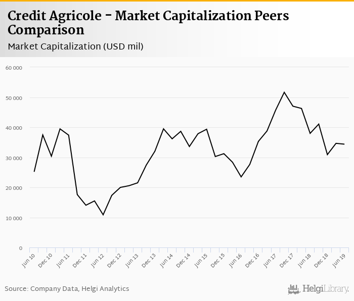 Credit Agricole stock traded at 10.5 per share at the end of second quarter of 2019 implying a market capitalization of USD 34,370 mil.
