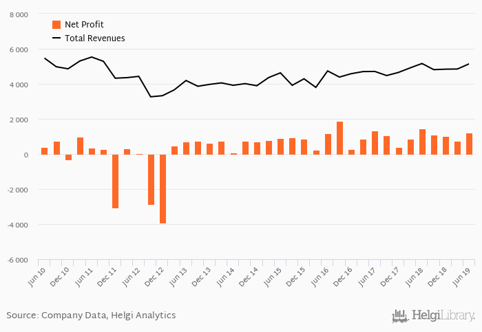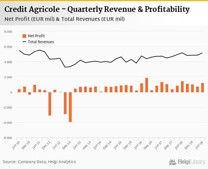 Credit Agricole made a net profit of EUR 1,222 mil under revenues of EUR 5,144 mil in the second quarter of 2019, down 14.9% and 0.329% respectively when compared to the same period last year.